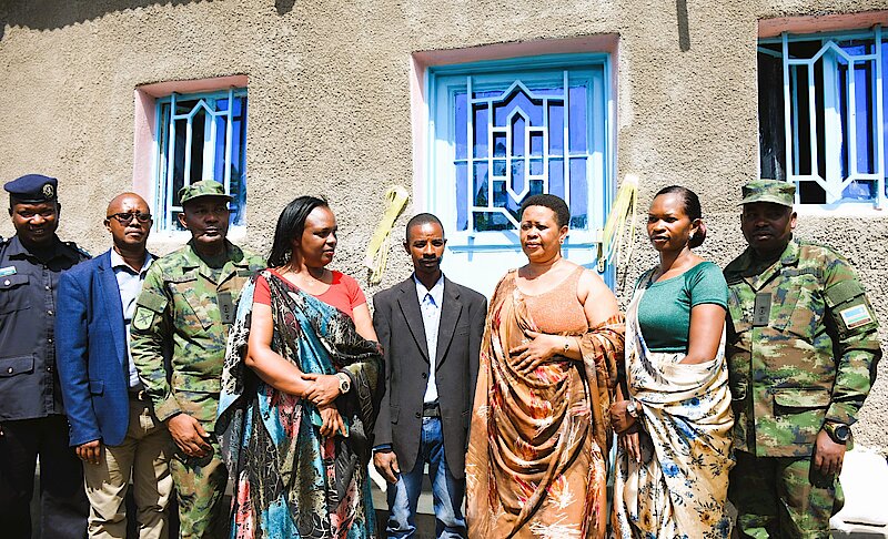Umuyobozi w’Akarere ka Karongi Madamu Mukarutesi Vestine ari kumwe na Perezida w’Inama Njyanama y’Akarere ka Karongi n’abagize inzego z’umutekano bishimanye n’abatuye aka karere bataha inzu 102 zubakiwe abasenyewe n’ibiza byatewe n'imvura nyinshi yaguye mu ntangiriro za Gicurasi 2023.
